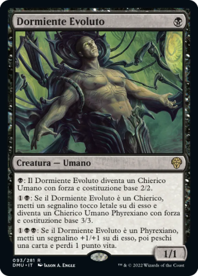 Brian giunse ad una soluzione intelligente. Ogni attivazione avrebbe potuto aggiungere un nuovo tipo di creatura alla creatura, agendo da condizione per l'attivazione successiva. Oltre a permetterci di racchiudere tutto il testo delle regole sulla carta, i tipi di creatura agivano anche dal punto di vista narrativo per aiutare a raccontare la storia del progresso della creatura. Dato che era in Vespro, Brian utilizzò il mana ibrido per il costo di mana e per le abilità attivate, permettendo alla carta di essere giocata in più mazzi.