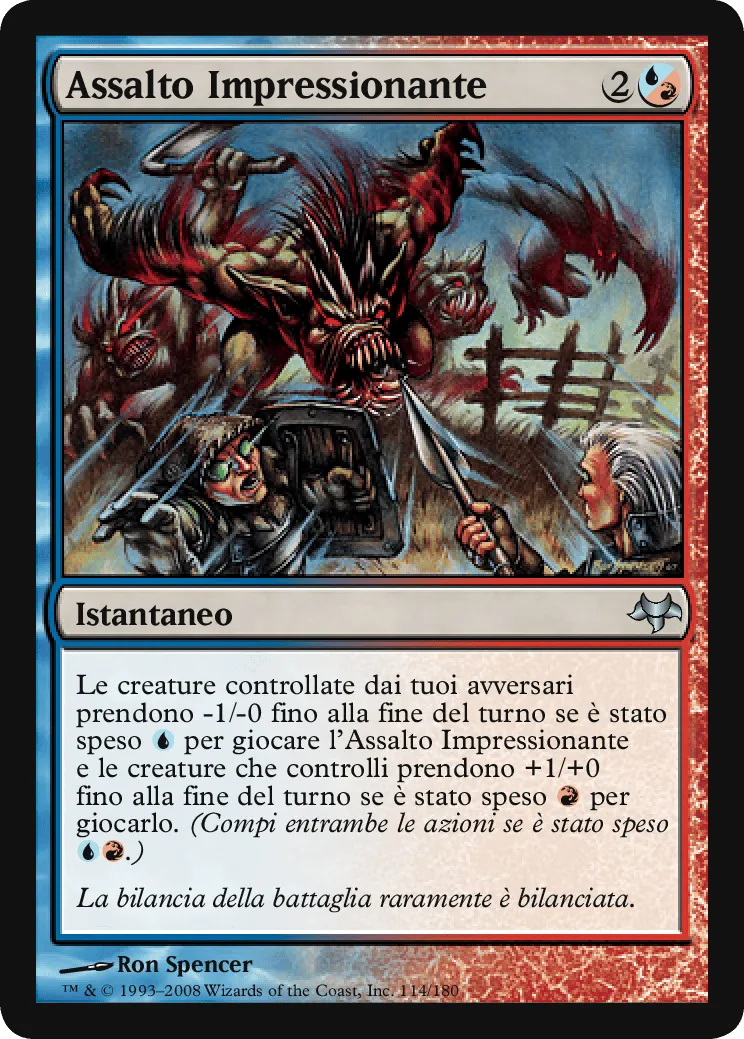 La risposta era sì. Invece di richiedere mana di un certo colore come costo addizionale, potevamo semplicemente fornire un bonus se si usava il colore secondario per lanciare la magia. Finimmo col creare un ciclo di 20 carte con questa abilità nel blocco originale di Ravnica: Città delle Gilde. Ne creammo 20 perché ogni gilda aveva una magia che andava in entrambe le direzioni.